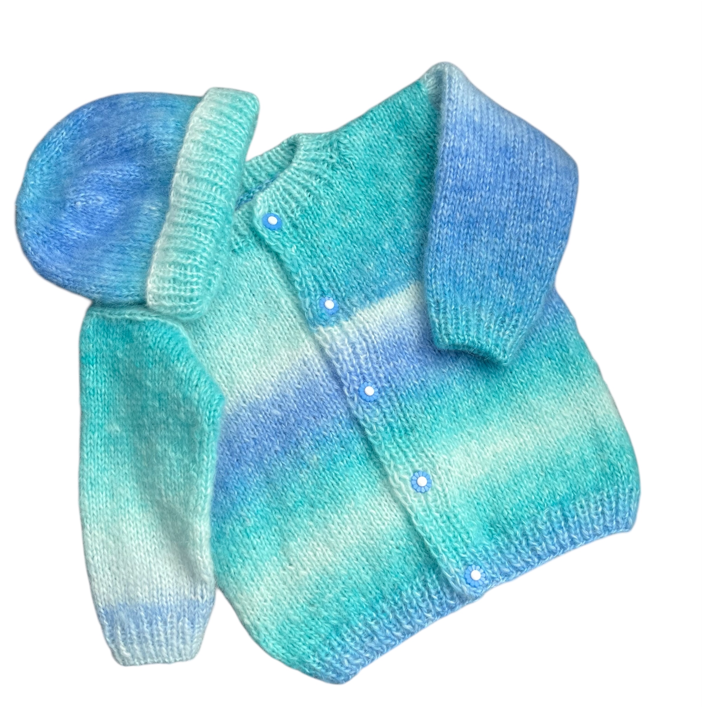 Dieses Jäggli aus Angorawolle ist wunderbar weich und kuschelig. Das Garn mit Farbverlauf von mint bis blau macht es einzigartig. Maschinenwäsche bis 40 Grad